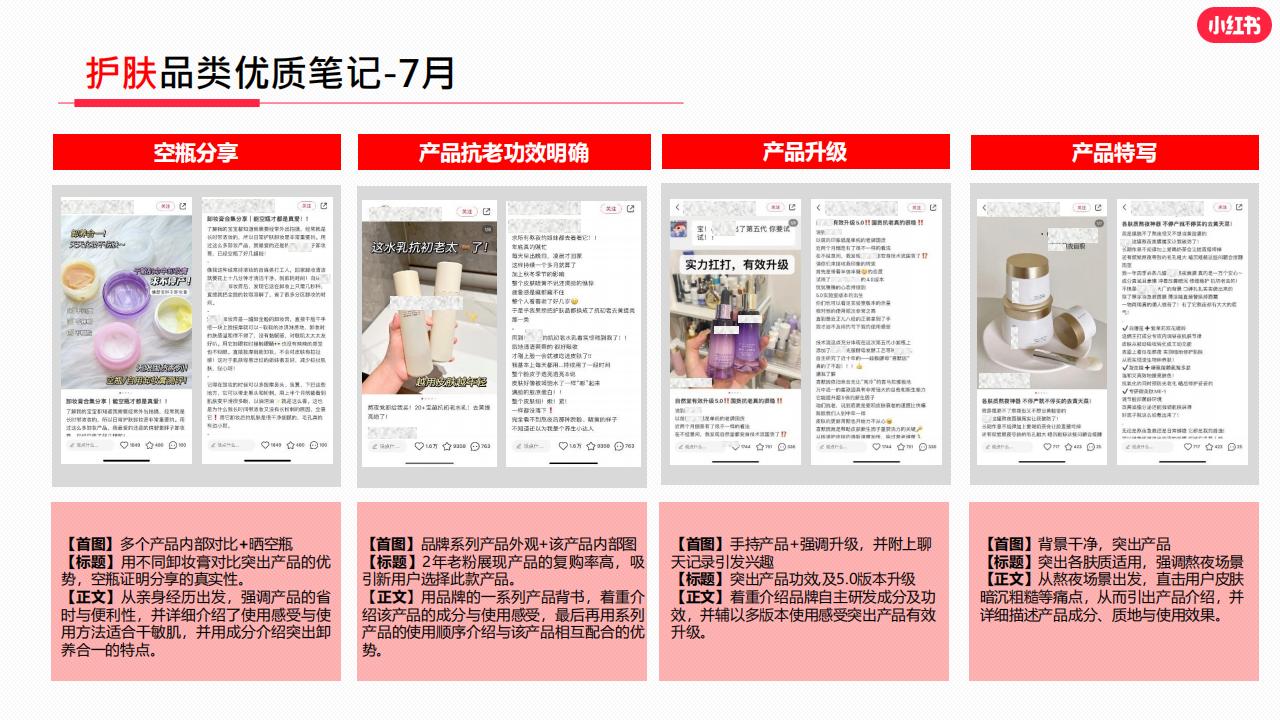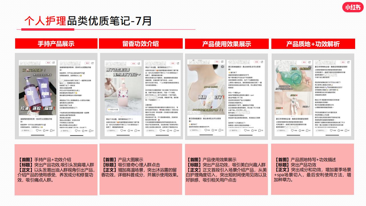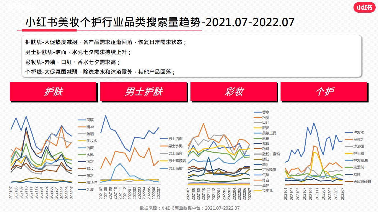 小红书美妆个护行业品类搜索量趋势,护肤线-大促热度减退,各产品需求逐渐回落,恢复日常需求状态;男士护肤线-洁面、水乳七夕需求持续上升; 彩妆线-唇釉,口红、香水七夕需求高; 个护线-大促氛围减弱,除洗发水和沐浴露外,其他产品回落。