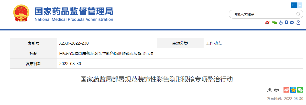 8月30日,国家药监局发布《关于开展规范装饰性彩色隐形眼镜生产经营行为专项整治行动的通知》(以下简称《通知》),决定自2022年9月1日起,在全国范围内组织开展为期3个月的规范装饰性彩色隐形眼镜生产经营行为专项行动。