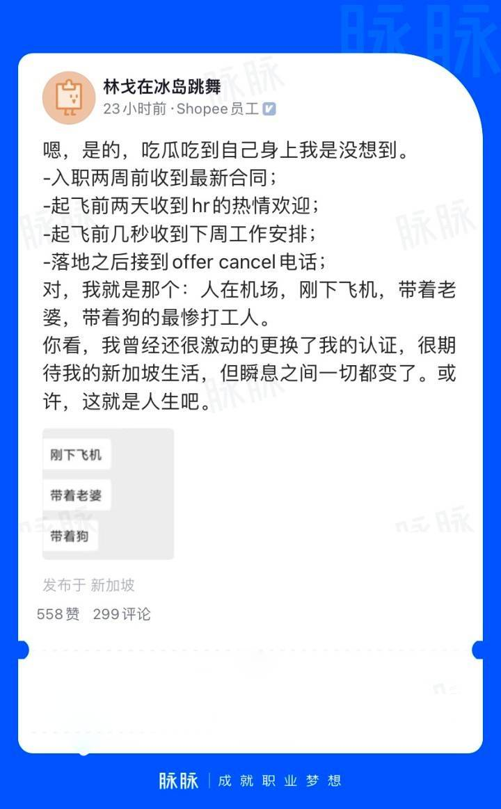 今年8月,不少求职者反映被Shopee毁约、毁offer,其中一位员工在脉脉表示,收到Shopee的offer后飞往新加坡准备入职,飞机起飞前才收到工作安排,刚落地就收到了offer取消的电话,引起了广泛共鸣。