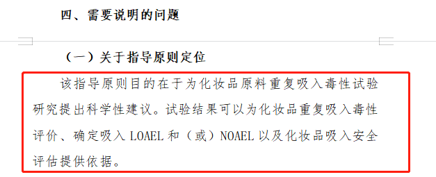 该《技术指导原则(征求意见稿)》目的在于为化妆品原料重复吸入毒性试验研究提出科学性建议。试验结果可以为化妆品重复吸入毒性评价、确定吸入LOAEL和(或)NOAEL以及化妆品吸入安全评估提供依据。