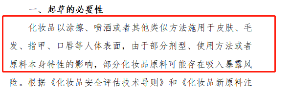 《技术指导原则(征求意见稿)》显示,化妆品以涂擦、喷洒或者其他类似方法施用于皮肤、毛发、指甲、口唇等人体表面,由于部分剂型、使用方法或者原料本身特性的影响,部分化妆品原料可能存在吸入暴露风险。