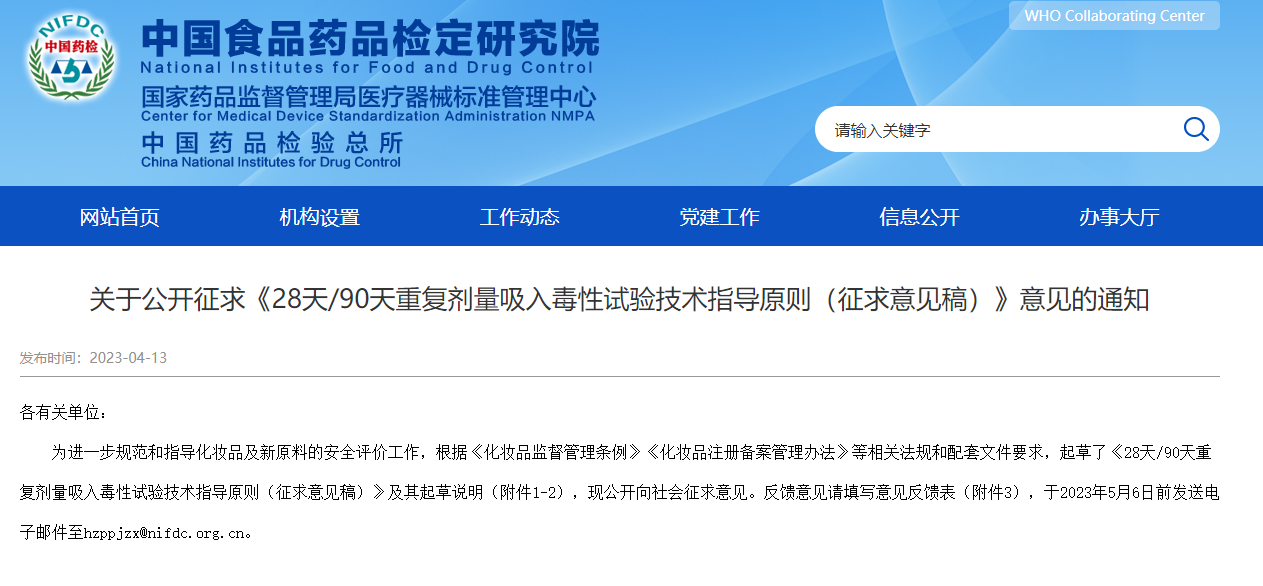 4月13日,中国食品药品检定研究院发布了《28天/90天重复剂量吸入毒性试验技术指导原则(征求意见稿)》(以下简称:《技术指导原则(征求意见稿)》),为化妆品原料重复吸入毒性试验研究提出科学性建议。