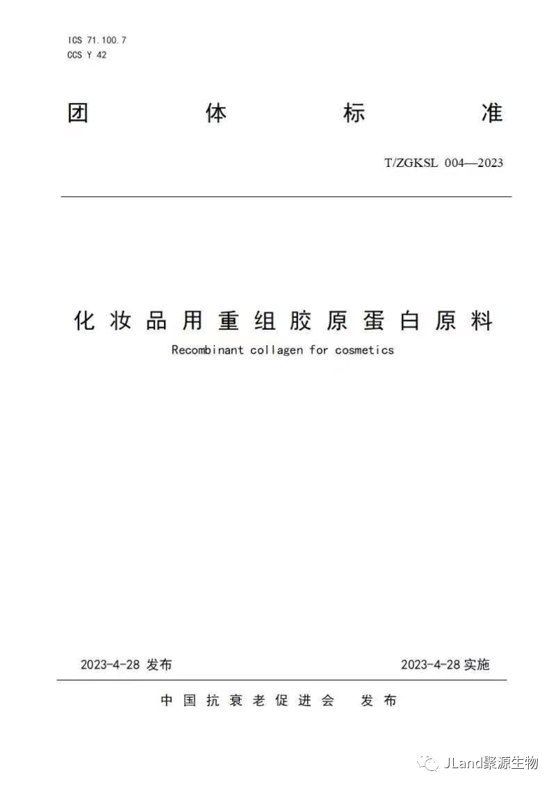 《化妆品用重组胶原蛋白原料》T/ZGKSL004-2023团体标准由西安巨子生物基因技术股份有限公司、江苏江山聚源生物技术有限公司、中国科学院过程工程研究所、西北大学、陕西省药品技术审评中心等多家单位共同起草,是中国化妆品行业首个重组胶原蛋白原料团体标准。