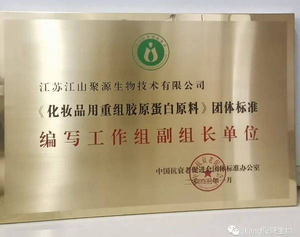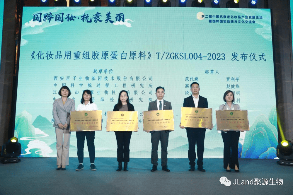 在发布会上,中国抗衰老促进会秘书长熊吉莹为参编单位与起草人颁发了牌匾与证书。聚源生物荣获了中国抗衰老促进会团体标准办公室颁布的《化妆品用重组胶原蛋白原料》团体标准编写工作组副组长单位。