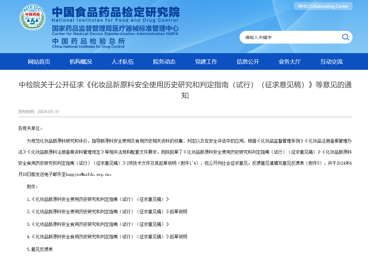 为规范化妆品新原料研究和评价,指导新原料安全使用及食用历史相关资料的收集、判定以及在安全评估中的应用,根据《化妆品监督管理条例》《化妆品注册备案管理办法》《化妆品新原料注册备案资料管理规定》等相关法规和配套文件要求,我院起草了《化妆品新原料安全使用历史研究和判定指南(试行)(征求意见稿)》《化妆品新原料安全食用历史研究和判定指南(试行)(征求意见稿)》2项技术文件及其起草说明(附件1~4),现公开向社会征求意见。反馈意见请填写意见反馈表(附件5),并于2024年6月18日前发送电子邮件至hzppjzx@nifdc.org.cn。