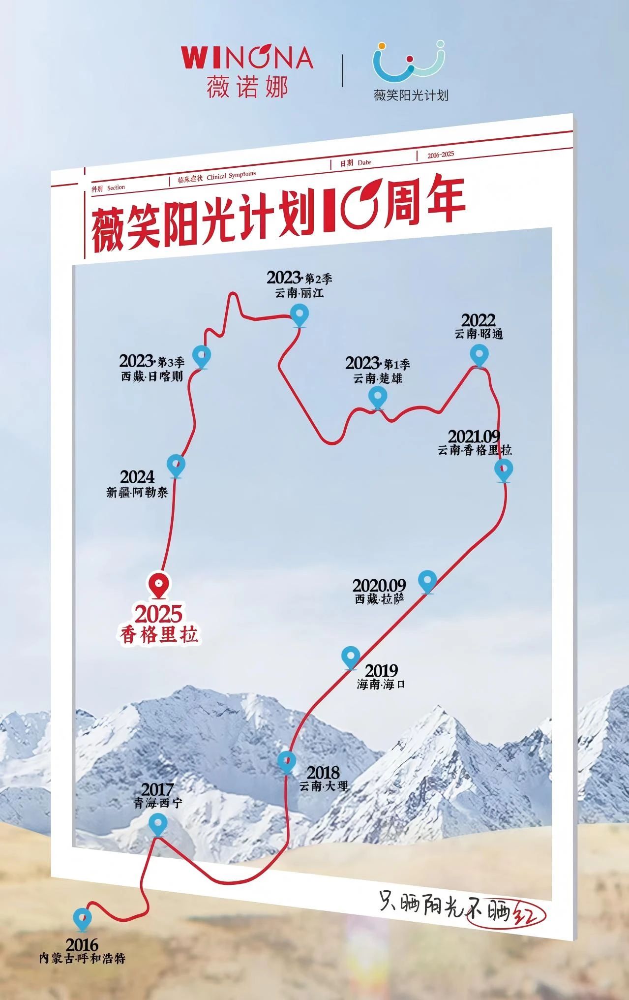 十年间,这项公益行动已然勾勒出一幅壮阔的足迹图。从内蒙古呼和浩特起步,穿越青海西宁、云南大理、海南海口、西藏拉萨、云南昭通、楚雄、丽江、西藏日喀则、新疆阿勒泰,直通云南香格里拉,足迹遍布中国紫外线最强区域。