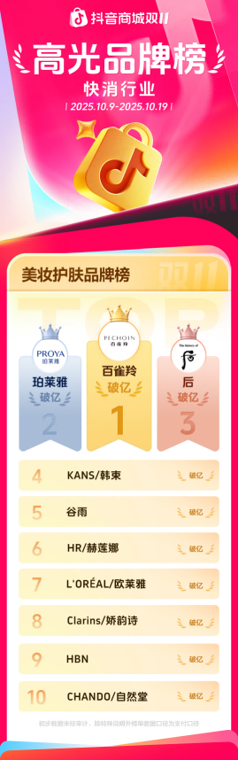 百雀羚登顶抖音美妆护肤品牌榜,成为今年双11战线中首个重大变化。