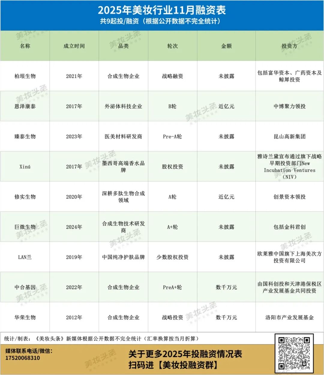 从合成生物赛道的扎堆抢投,到国际巨头对本土品牌的战略下注,11月的融资市场,正悄然勾勒出后流量时代美妆产业的价值重构方向。