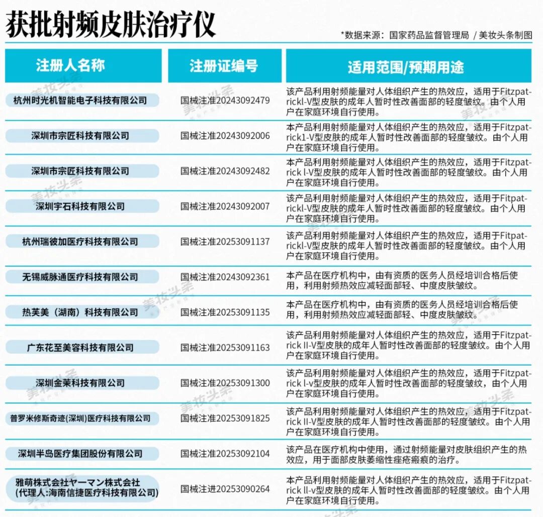 美妆头条观察发现,目前国内共有12款射频皮肤治疗仪获批上市,其中只有雅萌为进口品牌,另外11款分别来自深圳宗匠、深圳宇石、深圳金茉、深圳普罗米修斯、杭州时光机、杭州瑞彼加科技,热芙美、广州花至美容、半岛医疗。