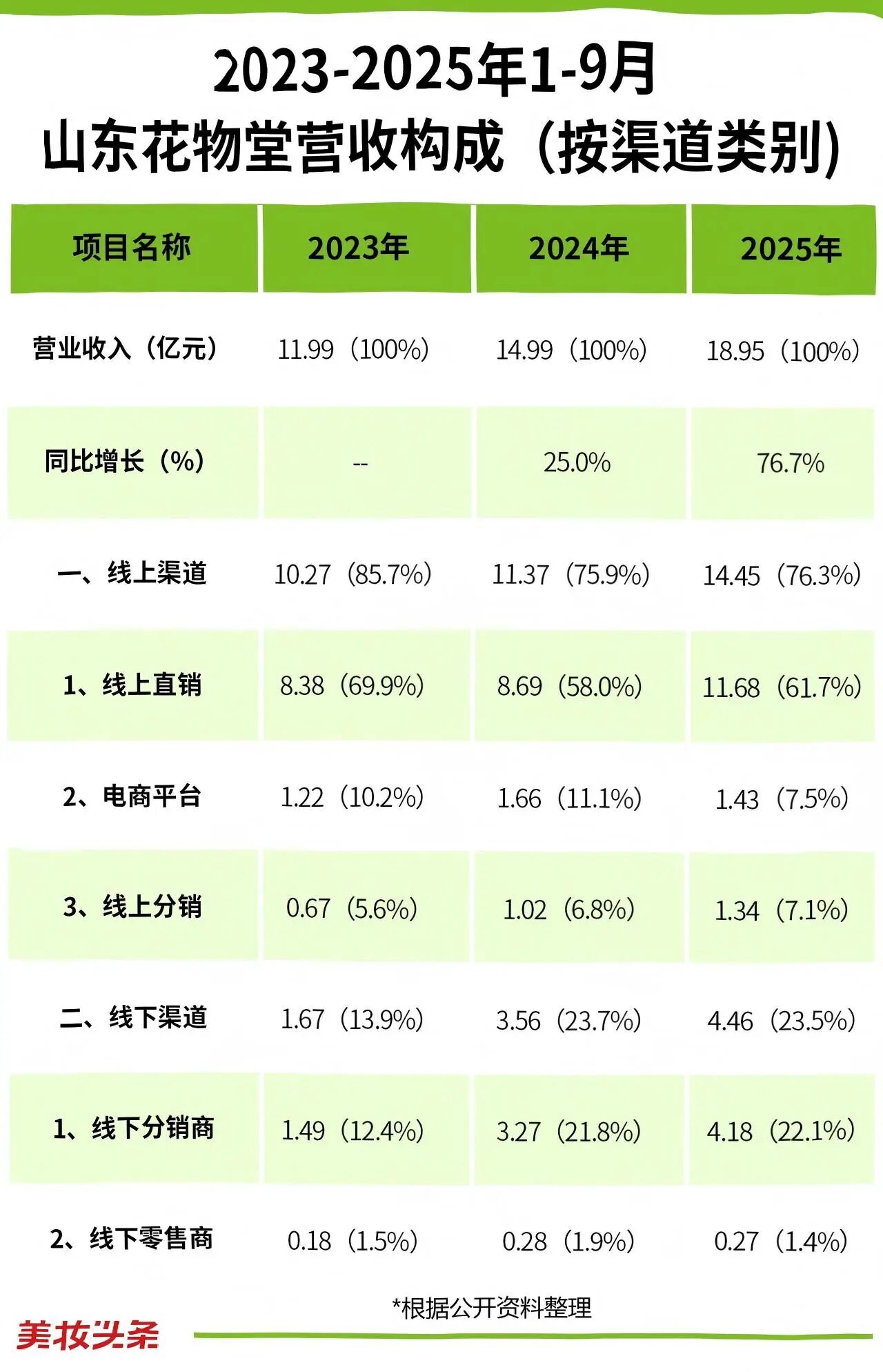 线上统治力:线上渠道收入占比常年超过75%。半亩花田是“All in 线上”的早期获益者,从淘系、京东到抖音、小红书,每一步渠道红利都精准踩中。2023-2025年前9个月,其营收均超75%。