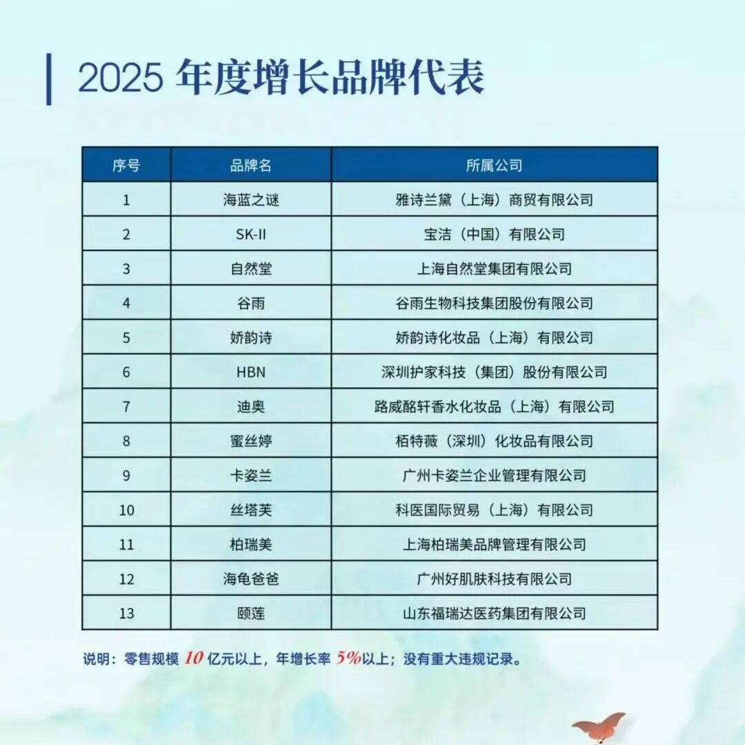 值得注意的是,颜江瑛理事长公布了2025年度品牌和增长品牌代表榜单。在这两份榜单中,百雀羚、毛戈平、丸美、自然堂、谷雨、HBN等品牌不仅在国内市场与国际高端品牌同台竞技,更在榜单中占据显著位置,展现出强大的品牌影响力和市场竞争力。