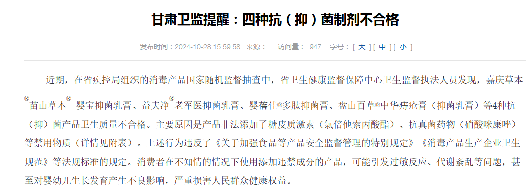 2024年10月,甘肃省卫生健康监督机构曾通报婴蓓佳多肽抑菌膏非法添加氯倍他索丙酸酯和硝酸咪康唑。而仅仅两个月后,该产品就改用新型激素氯倍他索丁酸酯继续生产销售。