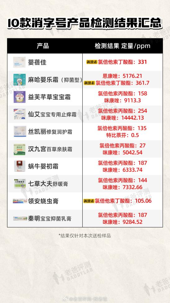 2021年,“益芙灵多效特护抑菌霜”违法添加激素导致婴儿出现“大头娃娃”症状的事件就曾引发全国关注;2023年,蜗牛婴初霜被检测出了抗生素他克莫司,含量0.034%,超出了成人适用量,甚至高于医用软膏标准(300mg/kg)。