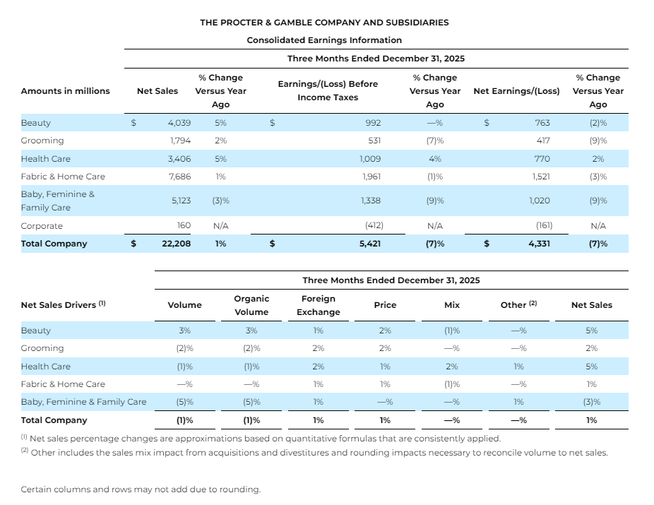 分业务板块来看,宝洁2026财年第二季度业绩各部门表现分化明显,美容与健康护理板块成为拉动增长的核心动力,而婴儿、女性及家庭护理板块则面临阶段性压力。