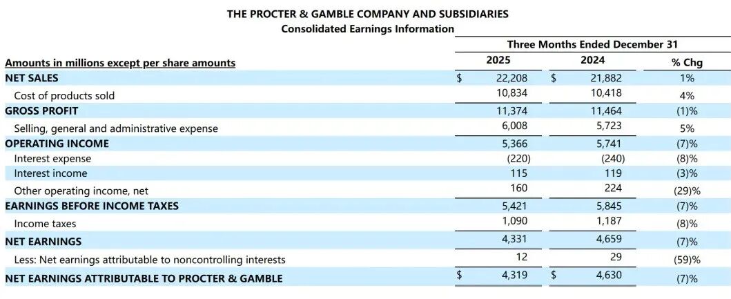 财报显示,宝洁2026财年第二季度(2025年10-12月)净销售额为222亿美元(约合人民币1545.9亿元),较上年同期增长1%。