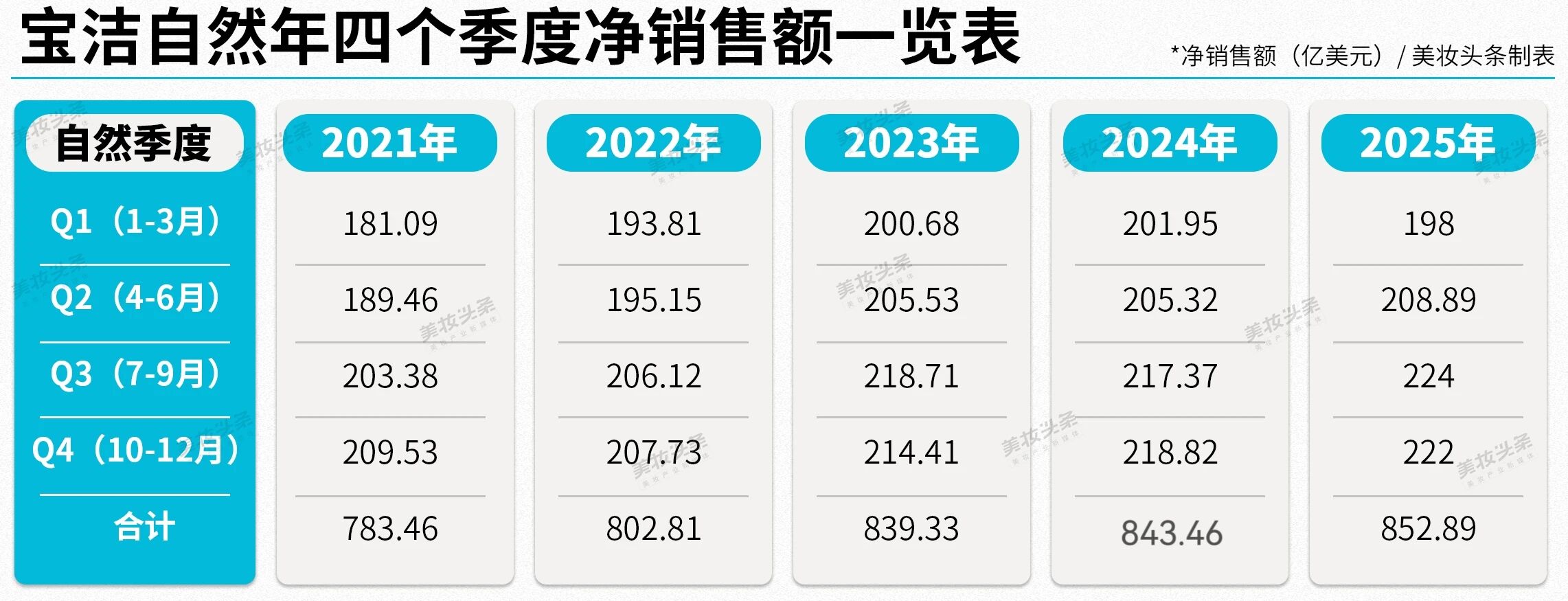 《美妆头条》根据此前发布的财报统计,2025年自然年,宝洁净销售额约为852.89亿美元(约合人民币5939.18 亿元)。