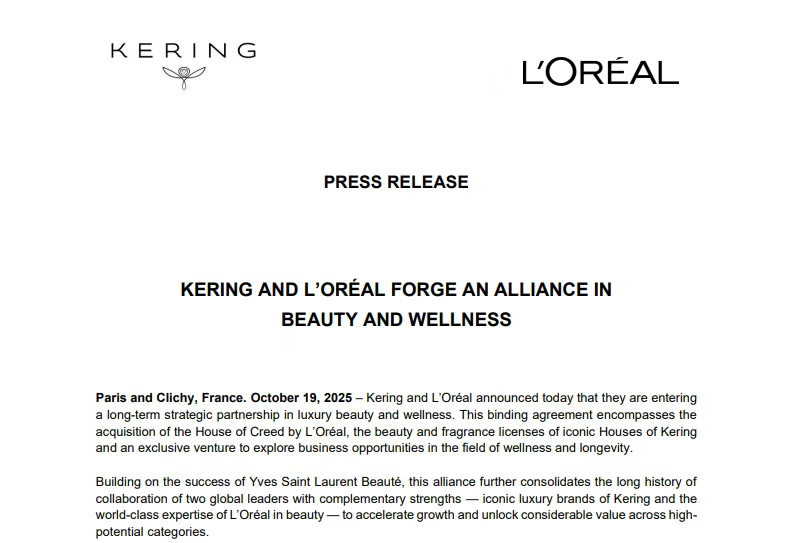 欧莱雅是典型案例。其在2025年动作频频:先是官宣以40亿欧元收购开云美妆50年的独家授权及高端沙龙香氛品牌Creed,随后将投资触角延伸至美国专业护发品牌ColorWow和英国高端皮肤科学品牌Medik8;此外,其还通过增资高德美,以及参投中国的自然堂、林清轩、兰、知原药业等功效护肤品牌、企业,进一步完善市场布局。
