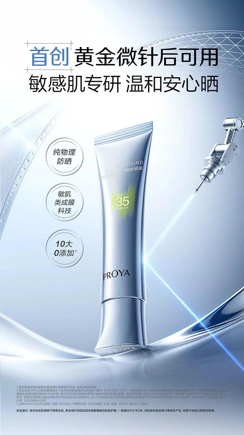 国货珀莱雅针对消费者美容项目后返黑、担忧防晒剂渗透的痛点,推出超膜蓝管防晒,主打“首创黄金微针后可用”。该产品由珀莱雅Time Lab联合三甲公立医院实测,经皮肤科医生全程评估,证实黄金微针术后使用温和无刺激,安全耐受。