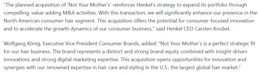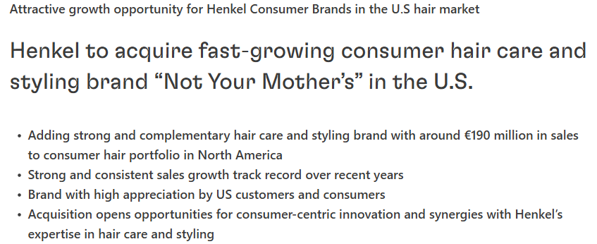 汉高首席执行官Carsten Knobel透露到, “计划收购'Not Your Mother's强化了汉高通过引人注目的增值并购活动扩大产品组合的战略。通过此次交易,我们将显着增强我们在北美消费者护发领域的地位。此次收购提供了以消费者为中心的创新潜力,并加速了我们消费者业务的增长动力。”