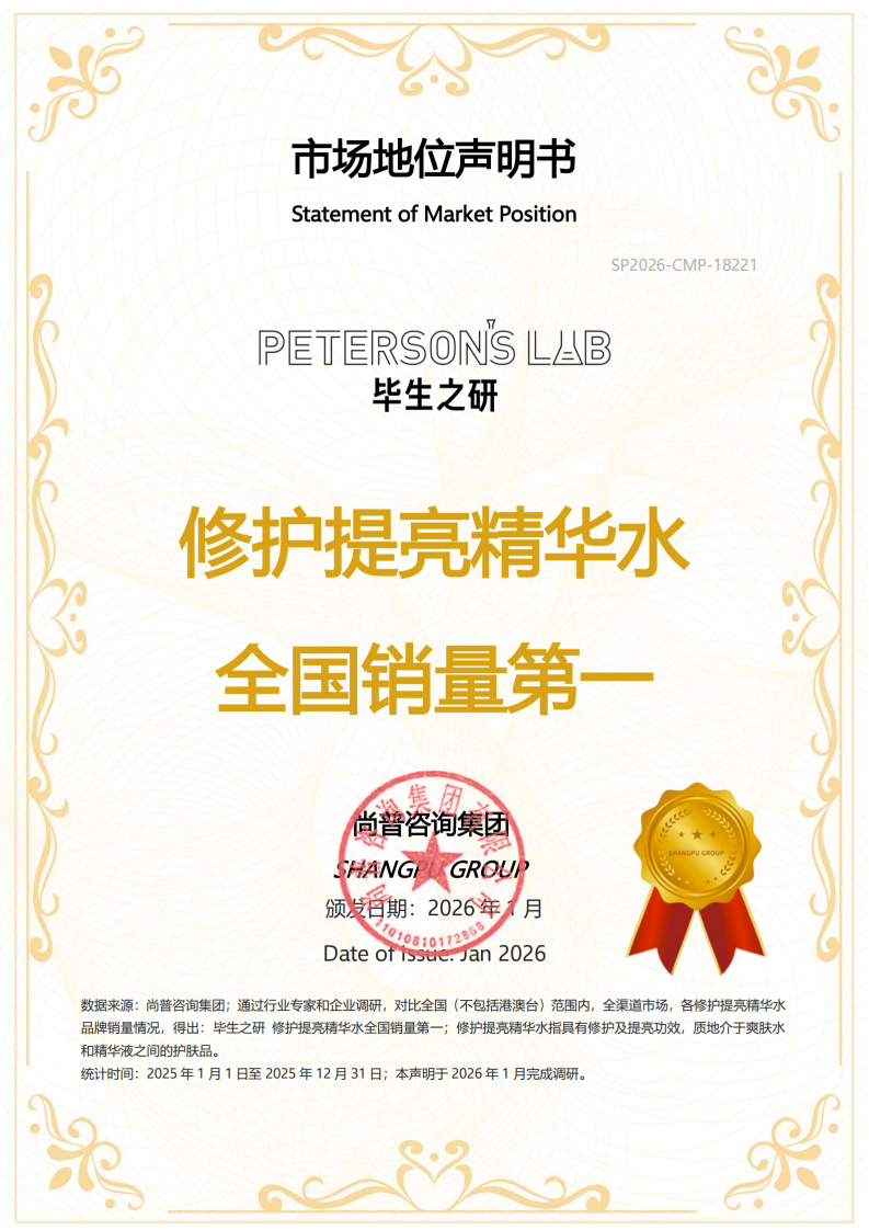 据尚普咨询的认证数据,截至2025年,毕生之研厚脸皮水荣获修护提亮精华水全国销量第一。