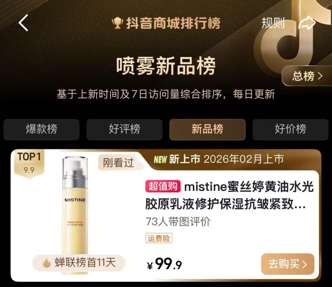 另据MISTINE蜜丝婷品牌方透露,“黄油乳喷”在产品上市初期未进行大规模宣发预热的情况下,便在中国核心社交电商平台(抖音)上拿下喷雾新品榜TOP 1,更在直播单链上线销售1小时创下销售额破100万的佳绩。