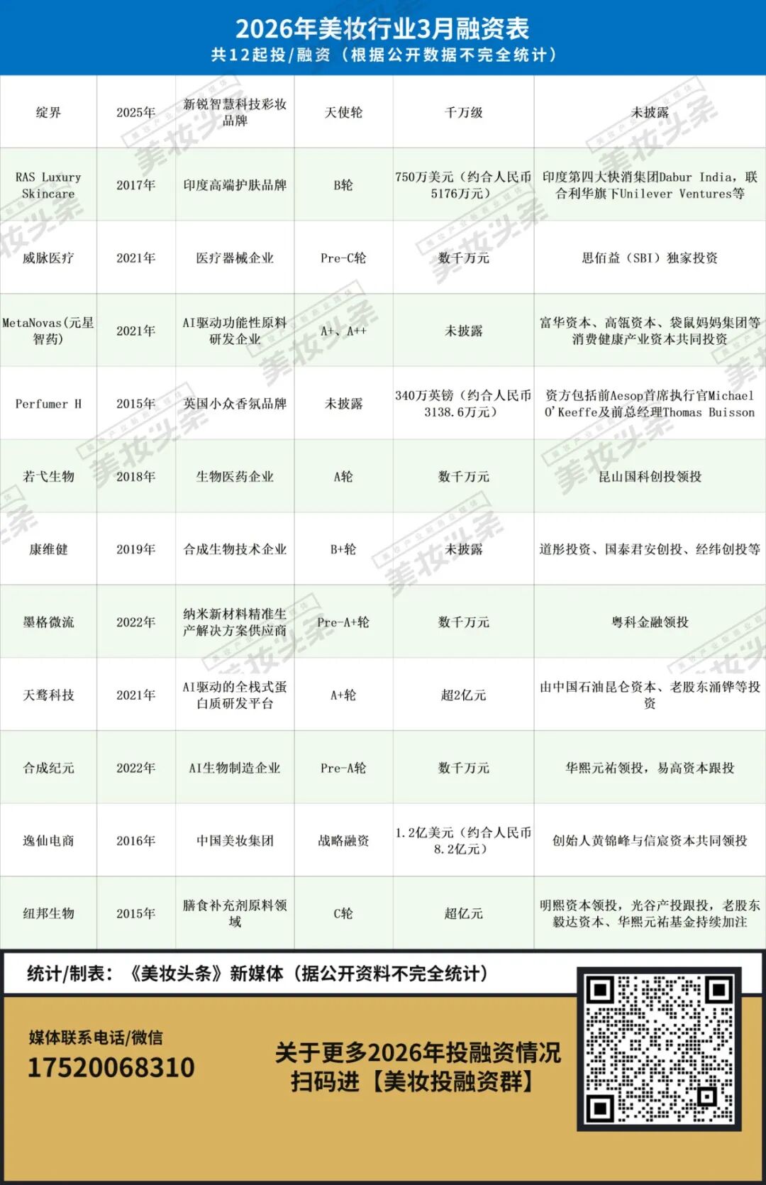 《美妆头条》新媒体不完全统计,2026年3月,美妆及相关领域共发生12起投融资事件,披露融资金额累计超12亿元。这笔集中入场的资本,悄悄透露着行业未来的发展方向。