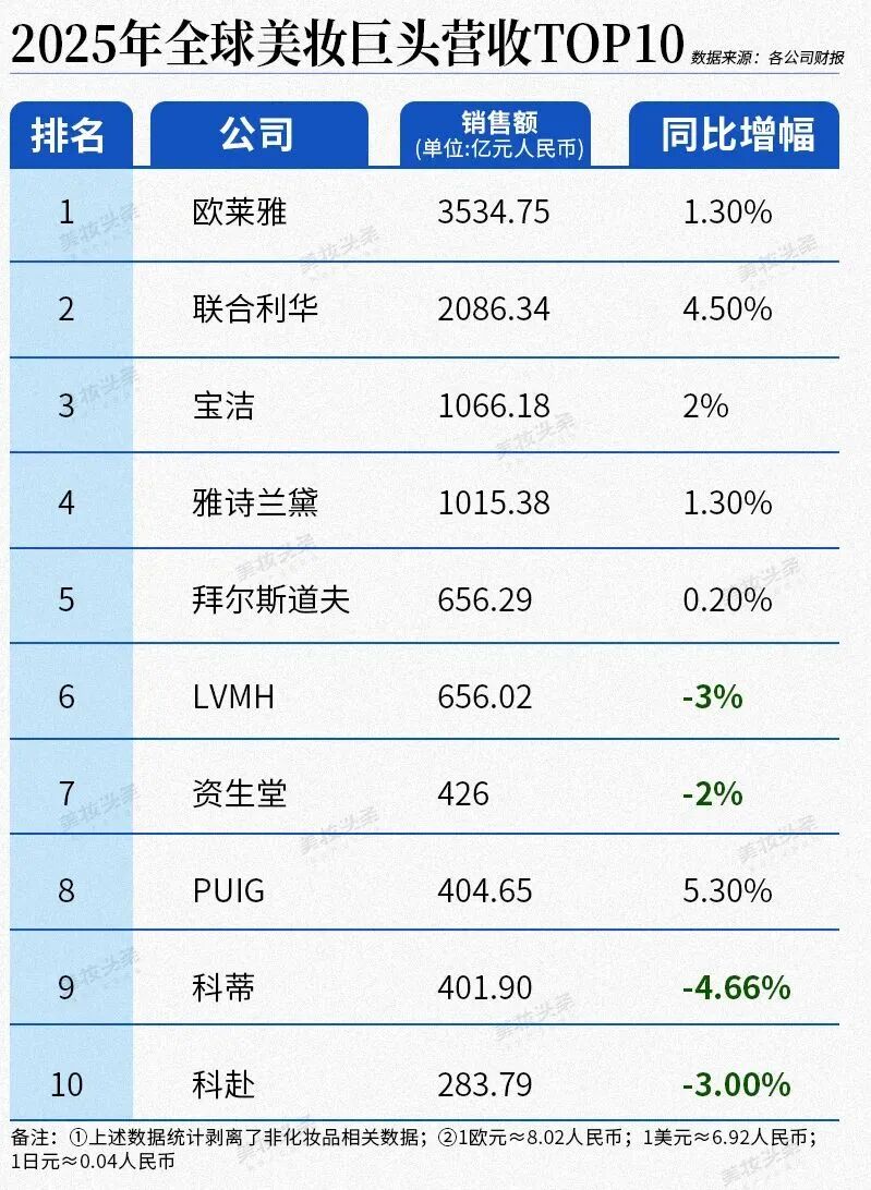 对比国内与国外美妆集团的2025年财报数据,可以得出几个非常清晰且值得关注的信息。