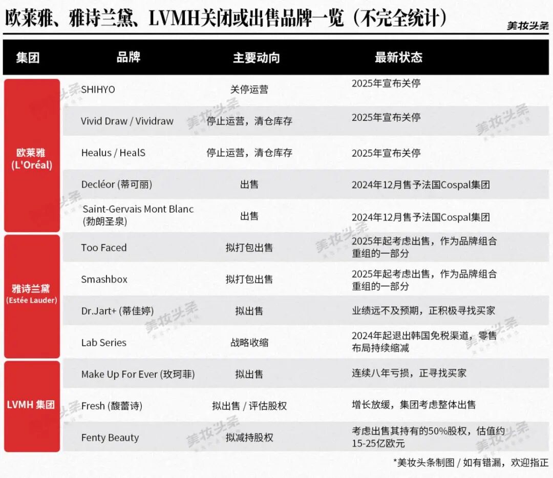 此外,成功的集团除了做加法,还懂得做“加减法”。2015至2020年间,宝洁出售了包括威娜、封面女郎在内的约100个品牌,将资源集中于SK-II、Olay等核心资产。欧莱雅、雅诗兰黛、LVMH这两年都考虑关闭或出售了业绩不佳的品牌线。