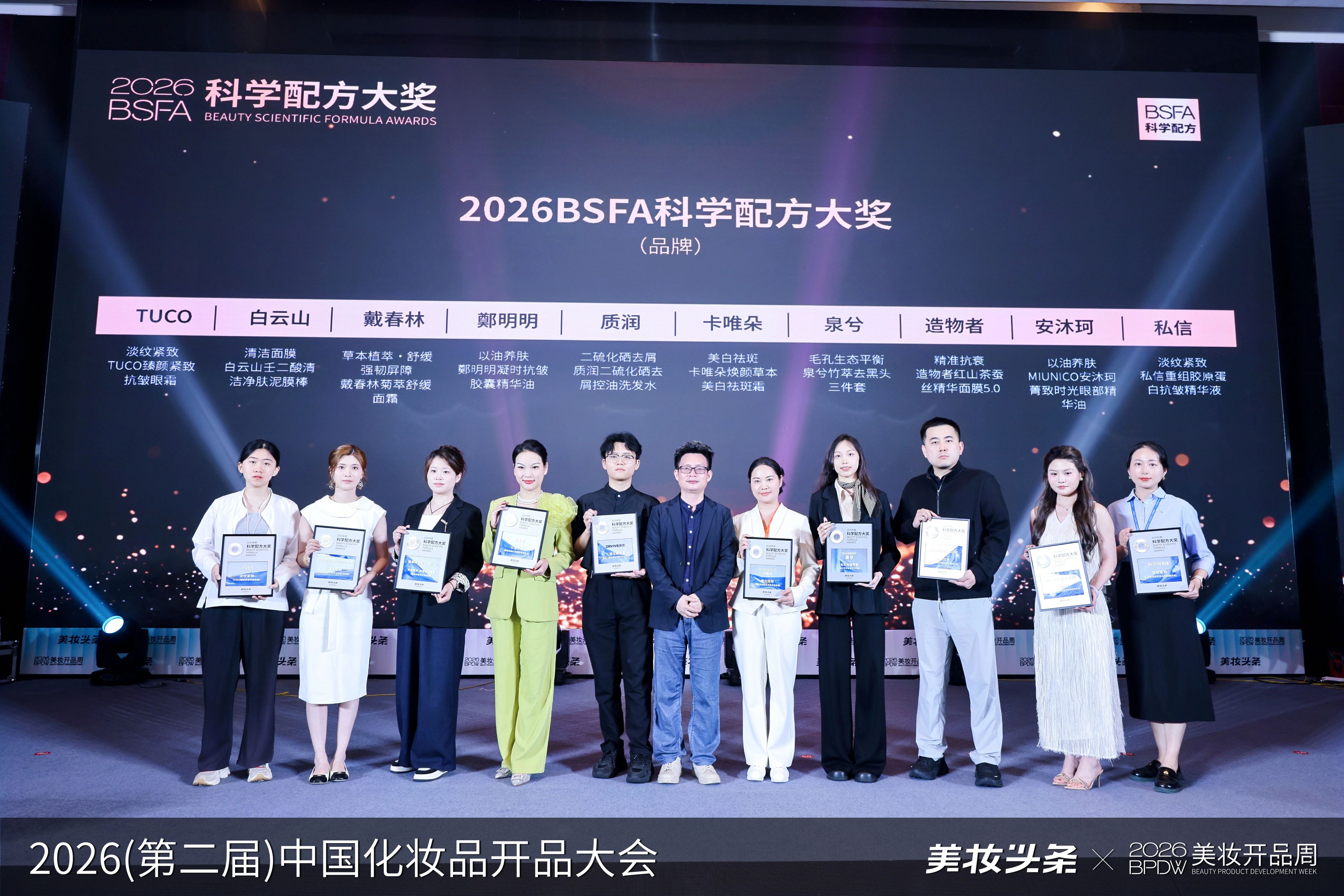 4月23日晚宴(同康药业×益云集团联合冠名赞助)现场,《美妆头条》盛大举行“2026BSFA科学配方大奖”颁奖盛典。